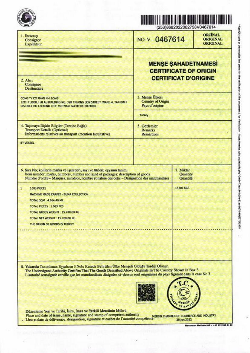 GIẤY CHỨNG NHẬN CHẤT LƯỢNG THẢM
