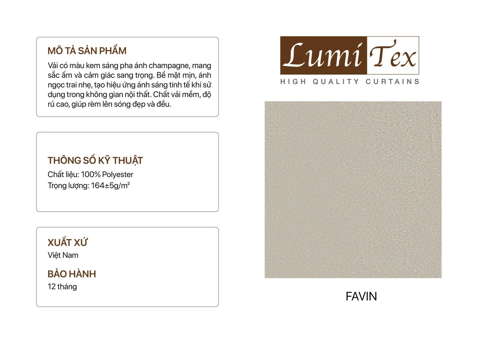 Rèm vải FAVIN tông kem sáng pha ánh champagne, mang lại cảm giác sang trọng và ấm áp. Bề mặt mịn, ánh ngọc trai nhẹ tạo hiệu ứng ánh sáng tinh tế khi sử dụng trong nội thất. Vải mềm, độ rũ cao giúp rèm lên sóng đẹp và đều.
