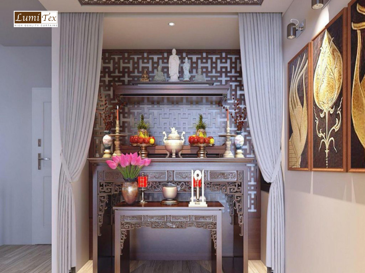 Phù Hợp Với Phong Cách Trang Trí: Chọn rèm cửa phù hợp với phong cách trang trí chung của không gian thờ. Đối với không gian truyền thống, rèm cửa với các họa tiết truyền thống và màu sắc trung tính là lựa chọn tốt.