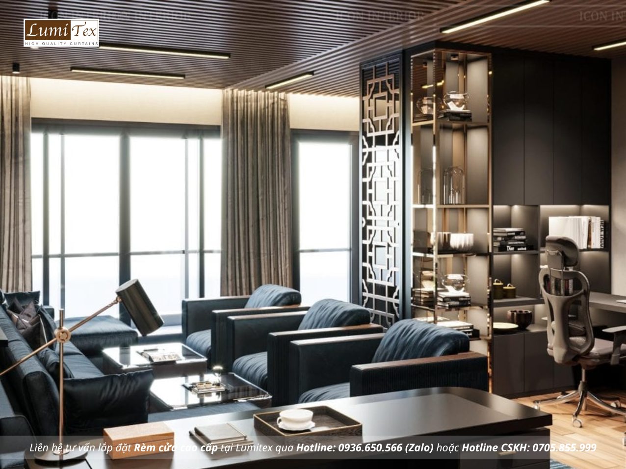 Trong không gian làm việc, các chuyên gia phong thủy khuyên nên chọn rèm vải một màu hoặc có hoa văn chìm trang nhã để tạo sự tập trung, tránh bị phân tán bởi các yếu tố bên ngoài. Khi được kết hợp tinh tế với đồ nội thất, rèm vải không chỉ tạo ra môi trường làm việc hiệu quả mà còn nâng cao tính thẩm mỹ của văn phòng.